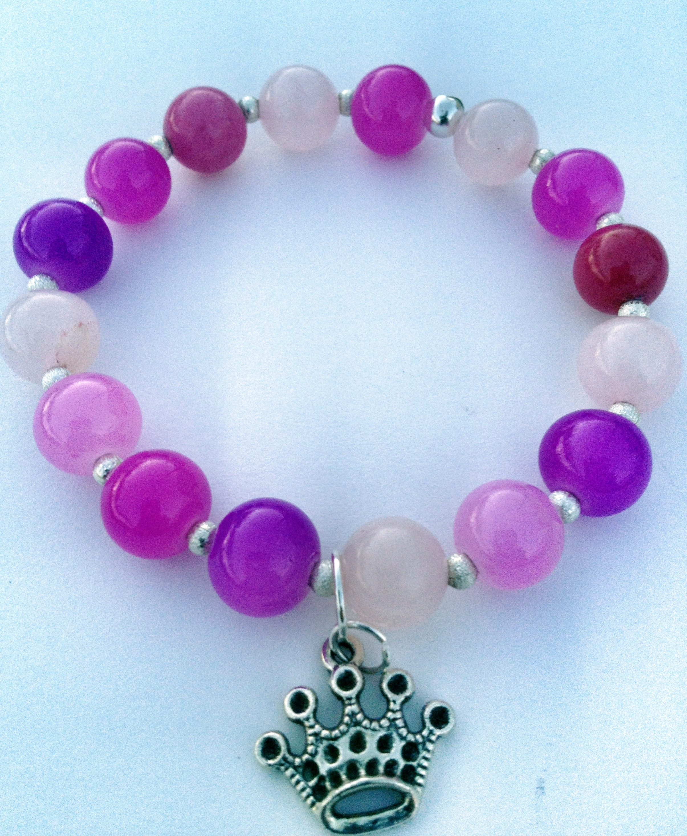 A mix of oink semi precious stone with silver dangling crown charm.