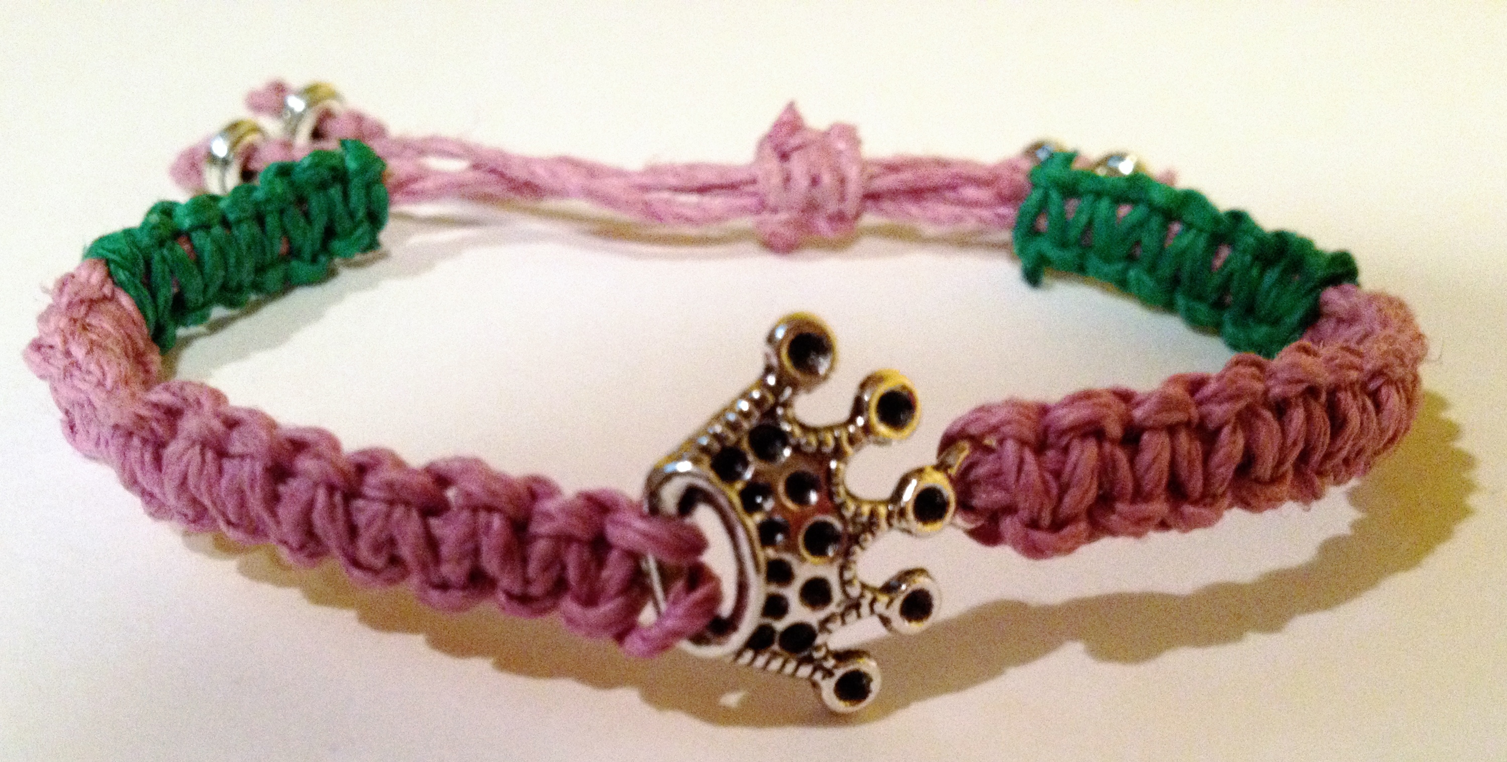 Color block pink and green friendship bracelet with silver crown charm.