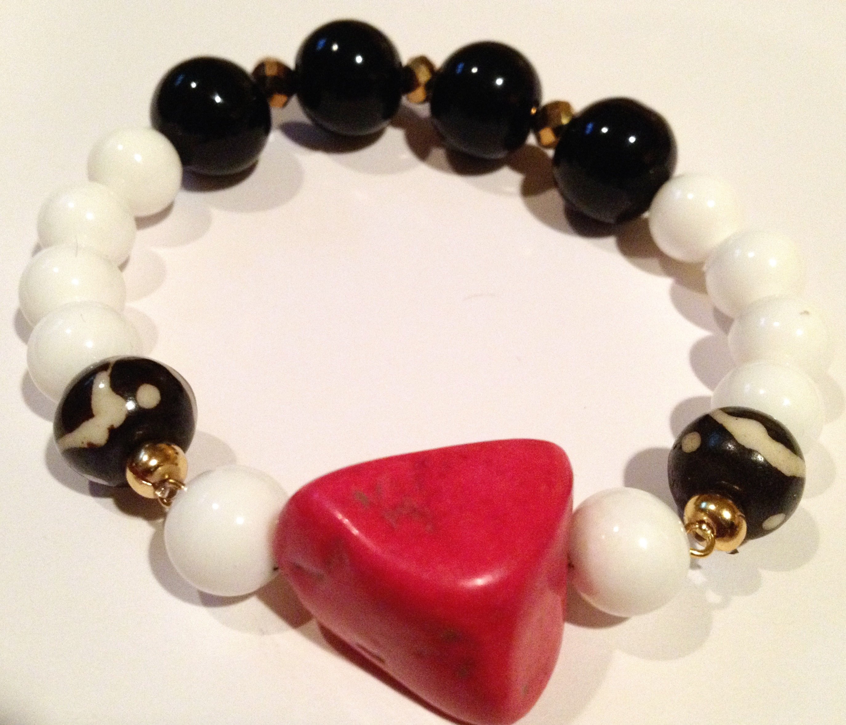 Chunky Red Stone cut in a triangle shape surrounded by black, white and tribal beads.