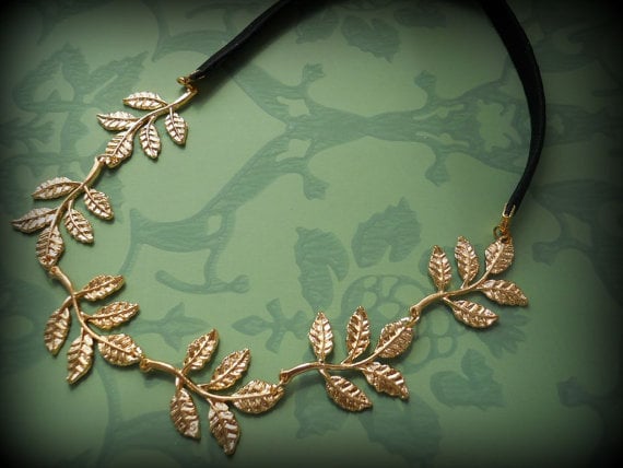 Beautiful headband featuring a chain of gold roman style leaves with a soft elasticated section for a comfortable fit.