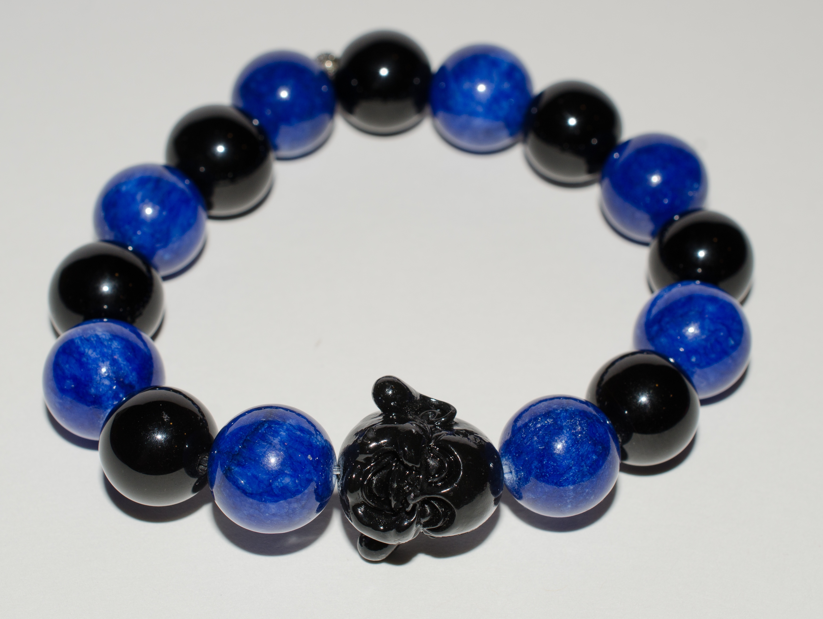 Black and Blue Semi precious agate stones with black Buddah head beads